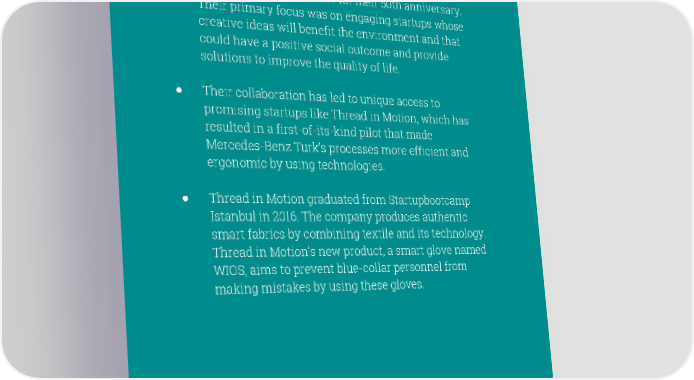 Highlights ● Mercedes-Benz Turk selected Starters Hub - Startupbootcamp’s strategic partner in Istanbul as its innovation partner in 2017 for their 50th anniversary. Their primary focus was on engaging startups whose creative ideas will benefit the environment and that could have a positive social outcome and provide solutions to improve the quality of life. ● Their collaboration has led to unique access to promising startups like Thread in Motion, which has resulted in a first-of-its-kind pilot that made Mercedes-Benz Turk’s processes more efficient and ergonomic by using technologies. ● Thread in Motion graduated from Startupbootcamp Istanbul in 2016. The company produces authentic smart fabrics by combining textile and its technology. Thread in Motion’s new product, a smart glove named WIOS, aims to prevent blue-collar personnel from making mistakes by using these gloves.