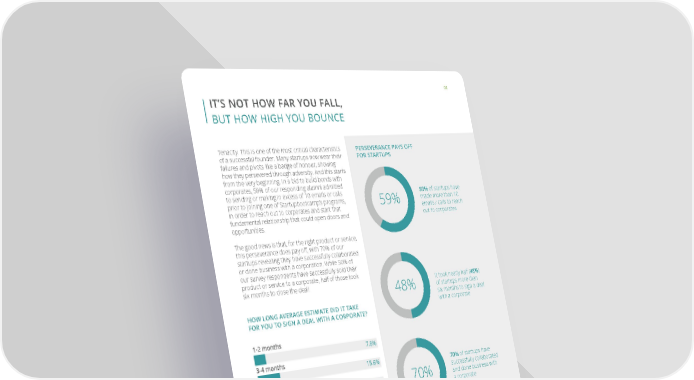 08 IT’S NOT HOW FAR YOU FALL, BUT HOW HIGH YOU BOUNCE Tenacity. This is one of the most critical characteristics PERSEVERANCE PAYS OFF of a successful founder. Many startups now wear their FOR STARTUPS failures and pivots like a badge of honour, showing how they persevered through adversity. And this starts from the very beginning. In a bid to build bonds with corporates, 59% of our responding alumni admitted to sending or making in excess of 10 emails or calls 59% of startups have prior to joining one of Startupbootcamp’s programs, 59% made more than 10 in order to reach out to corporates and start that emails / calls to reach fundamental relationship that could open doors and out to corporates opportunities. The good news is that, for the right product or service, this perseverance does pay off, with 70% of our startups revealing they have successfully collaborated or done business with a corporation. While 50% of our survey respondents have successfully sold their product or service to a corporate, half of those took six months to close the deal! It took nearly half (48%) 48% of startups more than six months to sign a deal HOW LONG AVERAGE ESTIMATE DID IT TAKE with a corporate FOR YOU TO SIGN A DEAL WITH A CORPORATE? 1-2 months 7.8% 3-4 months 15.6% 70% of startups have 5-6 months successfully collaborated 10.9% 70% and done business with More than 6 months a corporate 48.4% Not relevant 17.2% WHAT’S THE SOLUTION? Industry-specific accelerators and dedicated networking events for corporates and startups to meet, build foundations and inspire each other are just a few ways that the issues raised from our research can be turned on their heads.