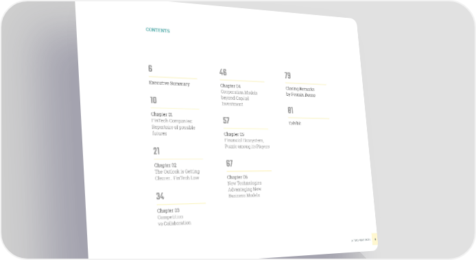 CONTENTS 6 46 79 Executive Summary Chapter 04 Closing Remarks Cooperation Models by FermÃn Bueno beyond Capital 10 Investment 81 Chapter 01 FinTech Companies: 57 Exhibit Repertoire of possible futures Chapter 05 Financial Ecosystem, 21 Puzzle among its Players Chapter 02 67 The Outlook is Getting Clearer… FinTech Law Chapter 06 New Technologies Advantaging New 34 Business Models Chapter 03 Competition vs Collaboration A TWO-WAY PATH 4