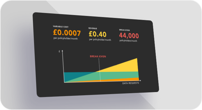 VARIABLE COST REVENUE BREAK-EVEN £0.0007 £0.40 44,000 per policyholder/month per policyholder/month policyholders/month £ BREAK-EVEN DATA REQUESTS