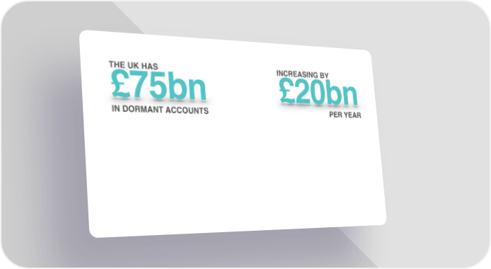 THE UK HAS INCREASING BY £75bn £20bn IN DORMANT ACCOUNTS PER YEAR VALIDATED DEVELOPED WE HAVE PROBLEM PLATFORM USERS REGISTER TODAY