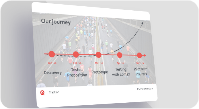 Our journey Jan ‘16 Feb ‘16 Mar ‘16 Apr ‘16 May ‘16 Discovery Tested Prototype Testing Pilot with Proposition with Lomax Insurers Traction #MyMomentum