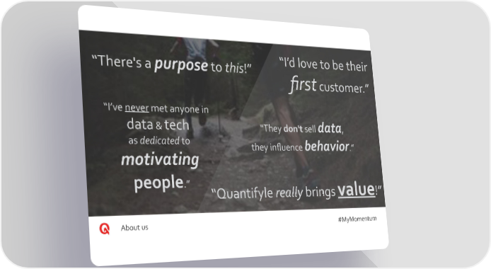 “There's a purpose to this!” “I’d love to be their first customer.” “I’ve never met anyone in data & tech “They don't sell data, as dedicated to they influence behavior.” motivating people.” “Quantifyle really brings value!” About us #MyMomentum