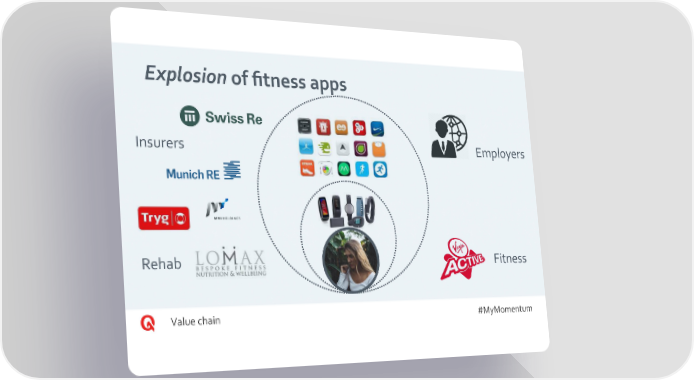 Explosion of ļ¬tness apps Insurers Employers Rehab Fitness Value chain #MyMomentum