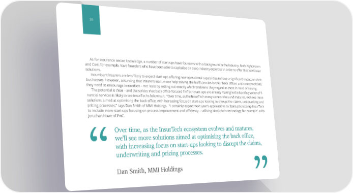 20 As for insurance sector knowledge, a number of start-ups have founders with a background in the industry. Both RightIndem and Covi, for example, have founders who have been able to capitalise on deep industry expertise in order to offer their particular solutions. Incumbent insurers are less likely to expect start-ups offering new operational capabilities to have a significant impact on their businesses. However, assuming that insurers want more help solving the inefficiencies in their back offices and core processes, they need to encourage innovation – not least by setting out exactly which problems they regard as most in need of solving. The potential is clear – and the strides that back office-focused FinTech start-ups are already making in the banking sector of fi- nancial services is likely to see InsurTechs follow suit. “Over time, as the InsurTech ecosystem evolves and matures, we’ll see more solutions aimed at optimising the back office, with increasing focus on start-ups looking to disrupt the claims, underwriting and pricing processes,” says Dan Smith of MMI Holdings. “I certainly expect next year’s applications to Startupbootcamp InsurTech to include more start-ups focusing on process improvement and efficiency – utilising blockchain technology for example” adds Jonathan Howe of PwC. Over time, as the InsurTech ecosystem evolves and matures, “ we’ll see more solutions aimed at optimising the back office, with increasing focus on start-ups looking to disrupt the claims, “underwriting and pricing processes. Dan Smith, MMI Holdings