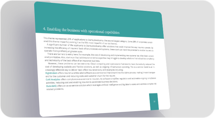 4. Enabling the business with operational capabilities This theme represented 21% of applications to Startupbootcamp, the second largest category. Some 38% of corporates consid- ered this theme impactful, ranking it as the fifth most impactful of our six themes. A significant number of the applicants to Startupbootcamp offer solutions that could improve the way insurers operate. By increasing the efficiency of insurers' back office processes and systems, these start-ups have the potential to enable insurers to operate more profitably at greater scale. There are barriers to entry here. For example, the cost of developing and implementing new systems has often been consid- ered prohibitive. Also, start-ups that lack insurance sector expertise may struggle to develop solutions that reflect the complexity and technicality of the back office of an insurance business. However, these problems can be overcome. Cloud computing and open-source frameworks have dramatically reduced the cost of developing scalable and flexible solutions, as well as ongoing infrastructure spending. The as-a-service model is an in- creasingly effective way to deliver back office insurance tools, with examples including: RightIndem offers insurers a white-label software-as-a-service tool that streamlines the claims process, making it more transpar- ent for the customer and reducing costs and customer churn for the insurer. CoVi Analytics offers compliance-as-a-service to insurers. Its software simplifies regulation and automates ongoing compliance activities, reducing cost and enabling insurers to accelerate business decisions. OutsideIQ offers an as-as-service solution which leverages artificial intelligence and big data to assess and address complex risk related problems. 19