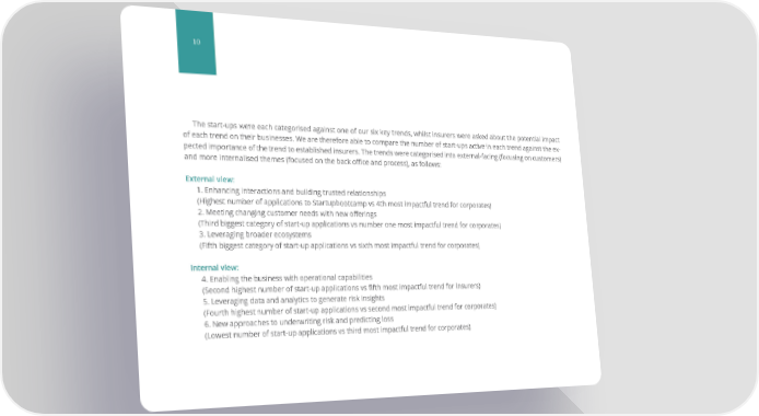 10 The start-ups were each categorised against one of our six key trends, whilst insurers were asked about the potential impact of each trend on their businesses. We are therefore able to compare the number of start-ups active in each trend against the ex- pected importance of the trend to established insurers. The trends were categorised into external-facing (focusing on customers) and more internalised themes (focused on the back office and process), as follows: External view: 1. Enhancing interactions and building trusted relationships (Highest number of applications to Startupbootcamp vs 4th most impactful trend for corporates) 2. Meeting changing customer needs with new offerings (Third biggest category of start-up applications vs number one most impactful trend for corporates) 3. Leveraging broader ecosystems (Fifth biggest category of start-up applications vs sixth most impactful trend for corporates) Internal view: 4. Enabling the business with operational capabilities (Second highest number of start-up applications vs fifth most impactful trend for insurers) 5. Leveraging data and analytics to generate risk insights (Fourth highest number of start-up applications vs second most impactful trend for corporates) 6. New approaches to underwriting risk and predicting loss (Lowest number of start-up applications vs third most impactful trend for corporates)