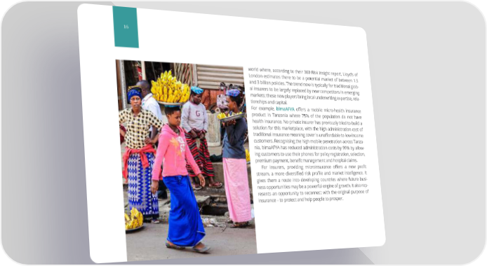 16 world where, according to their 360 Risk Insight report, Lloyd’s of London estimates there to be a potential market of between 1.5 and 3 billion policies. The trend now is typically for traditional glob- al insurers to be largely replaced by new competitors in emerging markets; these new players bring local underwriting expertise, rela- tionships and capital. Benny Marty / Shutterstock.com For example, bimaAFYA offers a mobile micro-health insurance product in Tanzania where 75% of the population do not have health insurance. No private insurer has previously tried to build a solution for this marketplace, with the high administration cost of traditional insurance meaning cover is unaffordable to low-income customers. Recognising the high mobile penetration across Tanza- nia, bimaAFYA has reduced administration costs by 99% by allow- ing customers to use their phones for policy registration, selection, premium payment, benefit management and hospital claims. For insurers, providing microinsurance offers a new profit stream, a more diversified risk profile and market intelligence. It gives them a route into developing countries where future busi- ness opportunities may be a powerful engine of growth. It also rep- resents an opportunity to reconnect with the original purpose of insurance – to protect and help people to prosper.