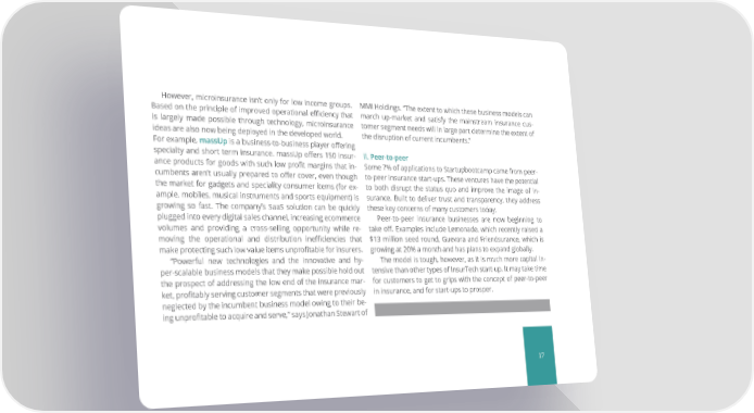However, microinsurance isn’t only for low income groups. MMI Holdings. “The extent to which these business models can Based on the principle of improved operational efficiency that march up-market and satisfy the mainstream insurance cus- is largely made possible through technology, microinsurance tomer segment needs will in large part determine the extent of ideas are also now being deployed in the developed world. the disruption of current incumbents.” For example, massUp is a business-to-business player offering specialty and short term insurance. massUp offers 150 insur- ii. Peer-to-peer ance products for goods with such low profit margins that in- Some 7% of applications to Startupbootcamp came from peer- cumbents aren’t usually prepared to offer cover, even though to-peer insurance start-ups. These ventures have the potential the market for gadgets and speciality consumer items (for ex- to both disrupt the status quo and improve the image of in- ample, mobiles, musical instruments and sports equipment) is surance. Built to deliver trust and transparency, they address growing so fast. The company’s SaaS solution can be quickly these key concerns of many customers today. plugged into every digital sales channel, increasing ecommerce Peer-to-peer insurance businesses are now beginning to volumes and providing a cross-selling opportunity while re- take off. Examples include Lemonade, which recently raised a moving the operational and distribution inefficiencies that $13 million seed round, Guevara and Friendsurance, which is make protecting such low value items unprofitable for insurers. growing at 20% a month and has plans to expand globally. “Powerful new technologies and the innovative and hy- The model is tough, however, as it is much more capital in- per-scalable business models that they make possible hold out tensive than other types of InsurTech start-up. It may take time the prospect of addressing the low end of the insurance mar- for customers to get to grips with the concept of peer-to-peer ket, profitably serving customer segments that were previously in insurance, and for start-ups to prosper. neglected by the incumbent business model owing to their be- ing unprofitable to acquire and serve,” says Jonathan Stewart of 17