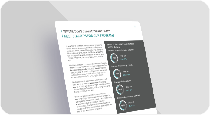 05 WHERE DOES STARTUPBOOTCAMP MEET STARTUPS FOR OUR PROGRAMS APPLICATION NUMBERS INCREASED In an effort to both find startups for our programs, as well as provide support for startup ecosystems BY 50% IN 2016 across the world, we ran 266 mentorship events in Number of applications per program: 53 countries in 2016, nearly double the amount we ran in the previous year. More than 10 events were hosted in the USA, Germany, Spain, India, and the 2016: 429 UK. +97% 2015: 218 We saw a dramatic increase in the amount of events we produced in North and South America, as well as Number of mentorship events: Central and Eastern Europe. With the opening of 2 new programs in Asia since this analysis, we expect to see quite a surge in applications from, and an 2016: 266 increase of events in the APAC region in 2017. +100% 2015: 133 Startupbootcamp also sources a large portion of their teams at major conferences and industry Number of cities visited: events. In 2016, we attended more than 40 including Pioneers Festival in Vienna, RISE in Hong Kong, and Wolves Summit in Warsaw. 2016: 102 While many accelerators and investors use +52% 2015: 67 events to simply filter teams into their programs, Startupbootcamp aims to create a true mentorship Number of conferences attended: environment that can produce valuable relationships. Teams that attend our FastTrack events are 2 times more likely to be accepted into 2016: 45 one of our acceleration programs. +55% 2015: 29 WE RAN MENTOHRSHIP EVENTS ON EVERY CONTINENT IN 2016