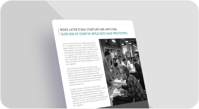 07 MORE LATER STAGE STARTUPS ARE APPLYING OVER 90% OF STARTUP APPLICANTS HAVE PROTOTYPES In 2015, we received around 3,000 total application to our programs and events. In 2016, that number nearly doubled. Even accounting for the addition of new programs, this marks a more than 50% increase in the amount of applications per program spot in our programs. Over 95% of teams have more than one team member, and the average funding raised prior to applying is now over €100,000. So how can a startup increase their chances of getting into one of our programs? One of the most important criteria we look at is the founding team. A solid founding team with past industry experience, technical expertise, and the ability to make well-reasoned decisions is of the utmost importance to any investor. We generally like to see both extensive technical and industry-specific expertise on the founding teams for our vertical- focused accelerators. However, being a solo founder, having a small engineering team, or being pre-revenue by no means eliminates your possibility of joining one of our programs. Past successes as a founder, a wealth of industry experience, a strong supporting team, or significant market or technical traction can significantly increase your chances of being accepted into one of our programs. 2016 PROGRAM TEAM AVERAGE STATS €8,200 €7,000 €169,600 Monthly Burn Rate Monthly Revenue Funding Raised 4.91 2.86 2.73 Employees Engineers Founders