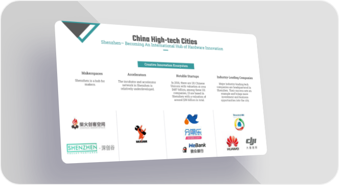 China High-tech Cities Shenzhen— Becoming An International Hub of Hardware Innovation Creative Innovation Ecosystem Makerspaces Accelerators Notable Startups Industry-Leading Companies Shenzhen is a hub for The incubator and accelerator In 2016, there are 131 Chinese Major industry-leading tech makers. network in Shenzhen is Unicorn with valuation at over companies are headquartered in relatively underdeveloped. $487 billion, among these 131 Shenzhen. Their success sets an companies, 13 are based in example and brings more Shenzhen with a valuation of investment and business around $39 billion in total. opportunities into the city.