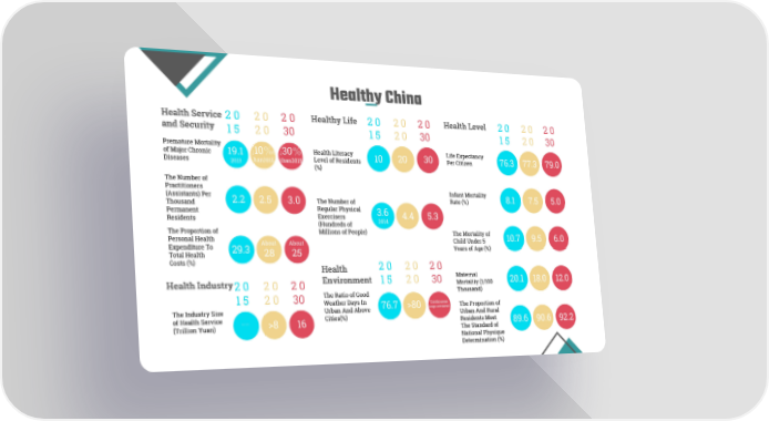 Healthy China Health Service Healthy Life Health Level 2 0 2 0 2 0 2 0 2 0 2 0 2 0 2 0 2 0 and Security 1 5 2 0 30 1 5 2 0 30 1 5 2 0 30 Premature Mortality Life Expectancy Health Literacy ↓10%t ↓30% of Major Chronic 19.1 20 30 10 Per Citizen 76.3 77.3 79.0 Level of Residents han2015 than2015 Diseases 2013 (%) The Number of Practitioners Infant Mortality (Assistants) Per 8.1 7.5 5.0 Rate (%) The Number of 2.2 2.5 3.0 Thousand Regular Physical Permanent 3.6 Exercisers 4.4 5.3 Residents 2014 (Hundreds of The Proportion of Millions of People) The Mortality of Personal Health 10.7 9.5 6.0 Child Under 5 About About Expenditure To Years of Age (%) 29.3 28 25 Total Health Costs (%) 2 0 2 0 2 0 Health Maternal Environment 1 5 2 0 30 20.1 18.0 12.0 Mortality (1/100 Health Industry 2 0 2 0 2 0 Thousand) The Ratio of Good 1 5 2 0 30 Weather Days In Continuous The Proportion of 76.7 >80 improvement The Industry Size Urban And Above Urban And Rural of Health Service Cities(%) —— Residents Meet >8 16 89.6 90.6 92.2 (Trillion Yuan) The Standard of National Physique Determination (%)