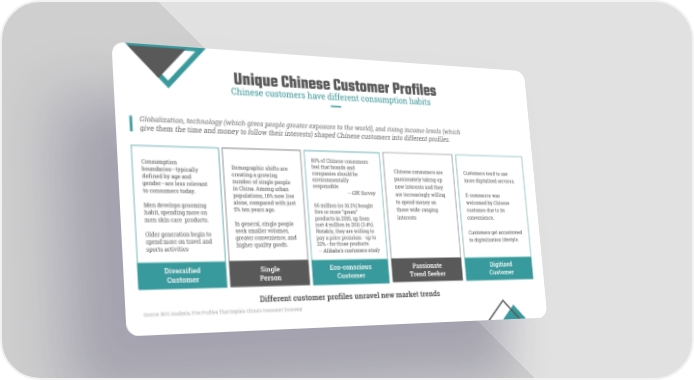 Unique Chinese Customer Profiles Chinese customers have different consumption habits Globalization, technology (which gives people greater exposure to the world), and rising income levels (which give them the time and money to follow their interests) shaped Chinese customers into different profiles. 80% of Chinese consumers Consumption feel that brands and Demographic shifts are Chinese consumers are Customers tend to use boundaries—typically companies should be creating a growing passionately taking up more digitalized services. defined by age and environmentally number of single people new interests and they gender—are less relevant responsible. in China. Among urban to consumers today. -- GfK Survey are increasingly willing E-commerce was populations, 16% now live to spend money on welcomed by Chinese alone, compared with just 66 million (or 16.2%) bought Men develops grooming those wide-ranging customer due to its 5% ten years ago. five or more “green” habit, spending more on interests convenience. products in 2015, up from men skin care products. In general, single people just 4 million in 2011 (3.4%). seek smaller volumes, Notably, they are willing to Customers get accustomed Older generation begin to greater convenience, and pay a price premium - up to spend more on travel and to digitalization lifestyle. higher-quality goods. 33% - for those products. sports activities -- Alibaba’s customers study Eco-conscious Passionate Digitized Diversified Single Customer Trend Seeker Customer Customer Person Different customer profiles unravel new market trends Source: BCG Analysis, Five Profiles That Explain China’s Consumer Economy