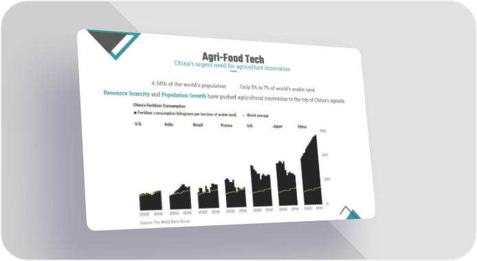 Agri-Food Tech China’s urgent need for agriculture innovation A fifth of the world’s population Only 5% to 7% of world’s arable land Resource Scarcity and Population Growth have pushed agricultural innovation to the top of China’s agenda.