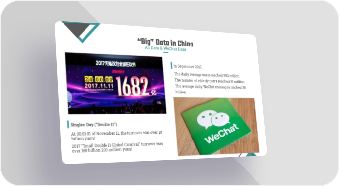 “Big” Data in China Ali Data & WeChat Data In September 2017, The daily average users reached 902 million. The number of elderly users reached 50 million. The average daily WeChat messages reached 38 billion. Singles’ Day (“Double 11”) At 00:03:01 of November 11, the turnover was over 10 billion yuan! 2017 "Tmall Double 11 Global Carnival" turnover was over 168 billion 200 million yuan!