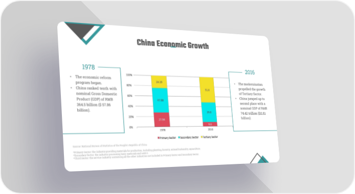 China Economic Growth 2016 1978 • The economic reform • The modernization program began. propelled the growth • China ranked tenth with of Tertiary Sector. nominal Gross Domestic • China jumped up to Product (GDP) of RMB second place with a 364.5 billion ($ 57.86 nominal GDP of RMB billion). 74.42 trillion ($11.81 billion). Source: National Bureau of Statistics of the People's Republic of China *Primary Sector: the industry providing materials for production, including planting, forestry, animal husbandry, aquaculture. *Secondary Sector: the industry processing basic materials and sold it. *Third Sector: the service industry containing all the other industries not included in Primary Sector and Secondary Sector.