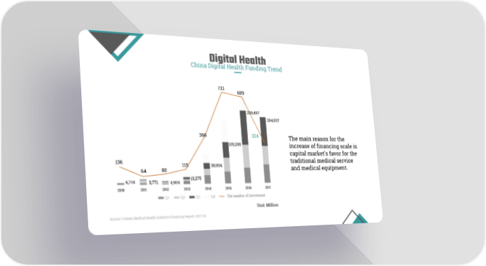 Digital Health China Digital Health Funding Trend 721 689 239,497 204,537 366 324 The main reason for the 105,295 increase of financing scale is capital market's favor for the traditional medical service 136 115 38,904 and medical equipment. 80 64 13,275 6,714 3,771 4,904 The number of investment Unit: Million Source: Vcbeat, Medical Health Industry Financing Report, 2017 Q3
