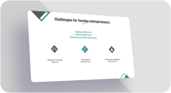 Challenges for foreign entrepreneurs. Language Difference Cultural Differences Internet Accessibility Restriction Different Customer “ChinaSpeed” Challenging Regulatory Behavior Manifestation Environment