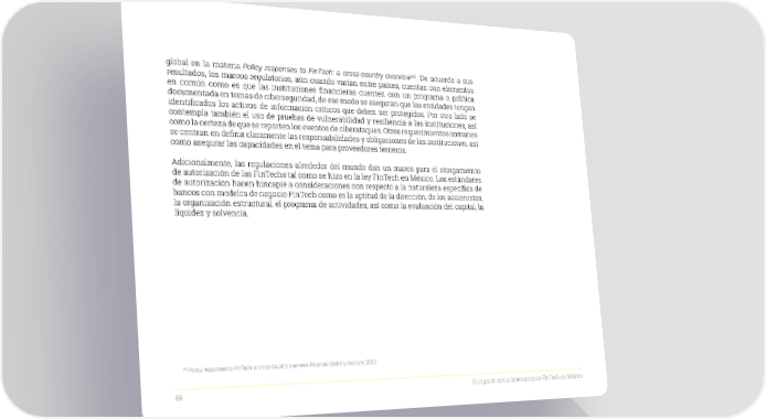 [52] global en la materia Policy responses to FinTech: a cross-country overview . De acuerdo a sus resultados, los marcos regulatorios, aún cuando varían entre países, cuentan con elementos en común como es que las instituciones financieras cuenten con un programa o política documentada en temas de ciberseguridad, de ese modo se aseguran que las entidades tengan identificados los activos de información críticos que deben ser protegidos. Por otro lado se contempla también el uso de pruebas de vulnerabilidad y resiliencia a las instituciones, así como la certeza de que se reporten los eventos de ciberataques. Otros requerimientos comunes se centran en definir claramente las responsabilidades y obligaciones de las instituciones, así como asegurar las capacidades en el tema para proveedores terceros. Adicionalmente, las regulaciones alrededor del mundo dan un marco para el otorgamiento de autorización de las FinTechs tal como se hizo en la ley FinTech en México. Los estándares de autorización hacen hincapié a consideraciones con respecto a la naturaleza específica de bancos con modelos de negocio FinTech como es la aptitud de la dirección, de los accionistas, la organización estructural, el programa de actividades, así como la evaluación del capital, la liquidez y solvencia. [52] Policy responses to FinTech: a cross-country overview, Financial Stability Institute, 2020 58 El impacto de las innovaciones FinTech en México