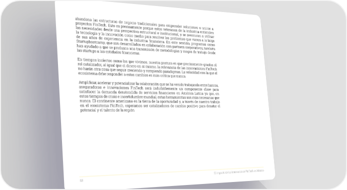 abandona las estructuras de negocio tradicionales para emprender soluciones o unirse a proyectos FinTech. Esto es precisamente porque estos veteranos de la industria entienden las necesidades desde una perspectiva estructural e institucional, y se aventuran a utilizar la tecnología y la innovación como medio para resolver los problemas que vieron a lo largo de sus años de experiencia en la industria financiera. En este sentido, programas como Startupbootcamp, que son desarrollados en colaboración con partners corporativos, también han ayudado a que se produzca una transmisión de metodologías y rasgos de trabajo desde las startups a las entidades financieras. En tiempos inciertos como los que vivimos, nuestra postura es que precisamente gracias al rol catalizador, al igual que el dinero en sí mismo, la relevancia de las innovaciones FinTech no harán otra cosa que seguir creciendo y rompiendo paradigmas. La velocidad con la que el ecosistema debe responder a estos cambios es más crítica que nunca. Amplificar, acelerar y potencializar la colaboración que se ha venido trabajando entre bancos, aseguradoras e innovaciones FinTech será indudablemente un componente clave para satisfacer la demanda desatendida de servicios financieros en América Latina ya que, en estos tiempos de crisis e incertidumbre mundial, estas herramientas son más necesarias que nunca. El continente americano es la tierra de la oportunidad y, a través de nuestro trabajo en el ecosistema FinTech, esperamos ser catalizadores de cambio positivo para desatar el potencial y el talento de la región. 63 El impacto de las innovaciones FinTech en México