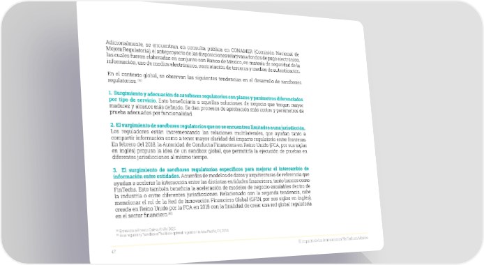 Adicionalmente, se encuentran en consulta pública en CONAMER (Comisión Nacional de Mejora Regulatoria), el anteproyecto de las disposiciones relativas a fondos de pago electrónico, las cuales fueron elaboradas en conjunto con Banco de México, en materia de seguridad de la información, uso de medios electrónicos, contratación de terceros y medios de autenticación. En el contexto global, se observan las siguientes tendencias en el desarrollo de sandboxes [39] regulatorios. 1. Surgimiento y adecuación de sandboxes regulatorios con plazos y parámetros diferenciados por tipo de servicio. Esto beneficiaría a aquellas soluciones de negocio que tengan mayor madurez y alcance más definido. Se dan procesos de aprobación más cortos y parámetros de prueba adecuados por funcionalidad. 2. El surgimiento de sandboxes regulatorios que no se encuentren limitados a una jurisdicción. Los reguladores están incrementando las relaciones multilaterales, que ayudan tanto a compartir información como a tener mayor claridad del impacto regulatorio entre fronteras. En febrero del 2018, la Autoridad de Conducta Financiera en Reino Unido (FCA, por sus siglas en inglés) propuso la idea de un sandbox global, que permitiría la ejecución de pruebas en diferentes jurisdicciones al mismo tiempo. 3. El surgimiento de sandboxes regulatorios específicos para mejorar el intercambio de información entre entidades. Acuerdos de modelos de datos y arquitecturas de referencia que ayudan a acelerar la interacción entre las distintas entidades financieras, tanto bancos como FinTechs. Esto también beneficia la aceleración de modelos de negocio escalables dentro de la industria o entre diferentes jurisdicciones. Relacionado con la segunda tendencia, cabe mencionar el rol de la Red de Innovación Financiera Global (GFIN, por sus siglas en inglés), creada en Reino Unido por la FCA en 2018 con la finalidad de crear una red global regulatoria [40] en el sector financiero. [38] Entrevista a Ernesto Calero, CNBV, 2020. [39] How regulatory “sandboxes” facilitate optimal regulation in Asia Pacific, EY, 2018. 47 El impacto de las innovaciones FinTech en México
