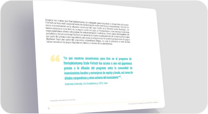 Durante los 3 años que Startupbootcamp ha trabajado para impulsar el desarrollo del sector FinTech se han visto casos de éxito de colaboración entre startups y corporativos. Uno de los casos sobresalientes es la alianza comercial del tipo Credit as a Service entre Banregio, un banco mexicano local líder en la región norte del país, y Prestanómico, una startup mexicana cuya plataforma ofrece soluciones de administración crediticia. Otros casos destacables del portafolio y del ecosistema FinTech en general incluyen la adquisición de la startup Konsigue por parte de la financiera Capitaltech, así como la adquisición de la startup mexicana de pagos digitales Payit por parte del unicornio colombiano Rappi, lo cual le permitió a este último lanzar servicios de pagos digitales en México a través de su plataforma. “Lo que nosotros encontramos para Vexi en el programa de Startupbootcamp Scale FinTech fue acceso a una red gigantesca gracias a la difusión del programa entre la comunidad de inversionistas locales y extranjeros de equity y deuda, así como de [6][6] aliados corporativos y otros actores del ecosistema” . Gabriela Estrada, Co-fundadora y CFO, Vexi [6] Entrevista a Gabriela Estrada, Vexi, 2020. 14 El impacto de las innovaciones FinTech en México