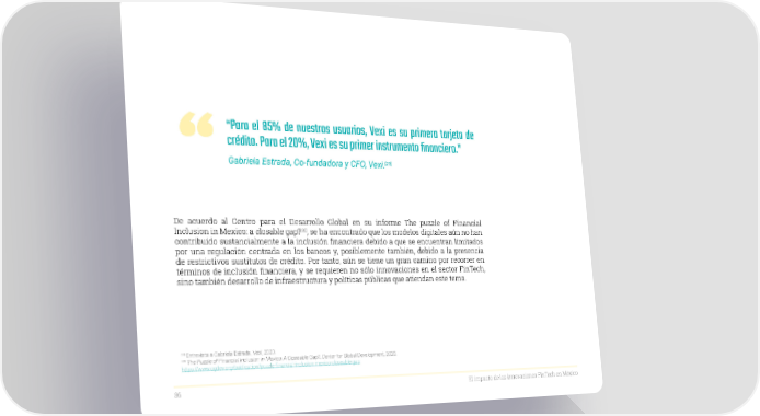 “Para el 85% de nuestros usuarios, Vexi es su primera tarjeta de crédito. Para el 20%, Vexi es su primer instrumento financiero.” [27] Gabriela Estrada, Co-fundadora y CFO, Vexi. De acuerdo al Centro para el Desarrollo Global en su informe The puzzle of Financial [28] Inclusion in Mexico: a closable gap? , se ha encontrado que los modelos digitales aún no han contribuido sustancialmente a la inclusión financiera debido a que se encuentran limitados por una regulación centrada en los bancos y, posiblemente también, debido a la presencia de restrictivos sustitutos de crédito. Por tanto, aún se tiene un gran camino por recorrer en términos de inclusión financiera, y se requieren no sólo innovaciones en el sector FinTech, sino también desarrollo de infraestructura y políticas públicas que atiendan este tema. [27] Entrevista a Gabriela Estrada, Vexi, 2020. [28] The Puzzle of Financial Inclusion in Mexico: A Closeable Gap?, Center for Global Development, 2020. https://www.cgdev.org/publication/puzzle-financial-inclusion-mexico-closeable-gap 36 El impacto de las innovaciones FinTech en México