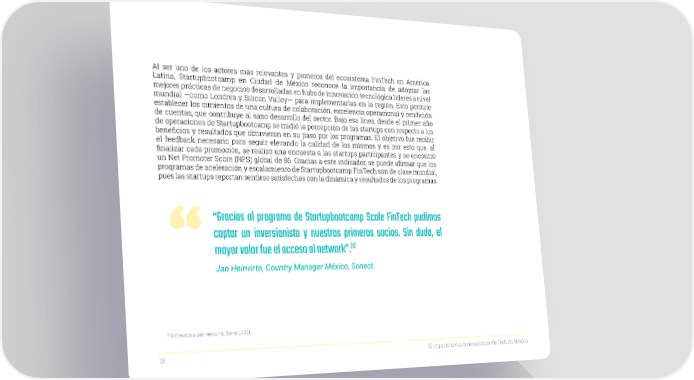 Al ser uno de los actores más relevantes y pioneros del ecosistema FinTech en América Latina, Startupbootcamp en Ciudad de México reconoce la importancia de adoptar las mejores prácticas de negocios desarrolladas en hubs de innovación tecnológica líderes a nivel mundial —como Londres y Silicon Valley— para implementarlas en la región. Esto permite establecer los cimientos de una cultura de colaboración, excelencia operacional y rendición de cuentas, que contribuye al sano desarrollo del sector. Bajo esa línea, desde el primer año de operaciones de Startupbootcamp se midió la percepción de las startups con respecto a los beneficios y resultados que obtuvieron en su paso por los programas. El objetivo fue recibir el feedback necesario para seguir elevando la calidad de los mismos y es por esto que, al finalizar cada promoción, se realizó una encuesta a las startups participantes y se encontró un Net Promoter Score (NPS) global de 86. Gracias a este indicador, se puede afirmar que los programas de aceleración y escalamiento de Startupbootcamp FinTech son de clase mundial, pues las startups reportan sentirse satisfechas con la dinámica y resultados de los programas. “Gracias al programa de Startupbootcamp Scale FinTech pudimos captar un inversionista y nuestros primeros socios. Sin duda, el [5][5] mayor valor fue el acceso al network”. Jan Heinvirta, Country Manager México, Sonect. [5] Entrevista a Jan Heinvirta, Sonect, 2020. 13 El impacto de las innovaciones FinTech en México