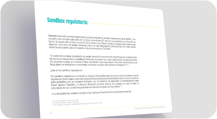 Sandbox regulatorio [33] También este año se está impulsando y promoviendo el sandbox regulatorio de la CNBV . De acuerdo con estudios globales de la firma consultora EY, esto es una práctica que ha sido un factor de desarrollo en otros hubs FinTech, tales como Reino Unido y Singapur por mencionar algunos. Con esto, se puede observar cómo se van adoptando prácticas que en otros países están funcionando para el fomento a la innovación en FinTech. “A través del sandbox regulatorio se puede permitir la innovación tecnológica en la prestación de servicios financieros, desafiando la forma de hacer las cosas, mejorando la experiencia de los usuarios finales, al vincular dicha innovación con una mayor inclusión financiera, que a largo plazo se traduzca en una mejor inclusión social y crecimiento económico.” [34] ¿Qué es un sandbox regulatorio? Un sandbox regulatorio provee de un espacio de pruebas para la innovación en balance con la regulación. Este espacio permite a las instituciones financieras habilitar servicios innovadores para probarlos con un alcance limitado, con el objetivo de aprender y retroalimentar para hacer ajustes. También, su alcance limitado permite reducir los riesgos, en caso de que los resultados de las iniciativas puestas en marcha no sean los esperados. [35] A nivel global, los sandbox ayudan a las startups Fintech de las siguientes maneras: [33] Entrevista a Ernesto Calero, CNBV, 2020. [34] Entrevista a Ernesto Calero, CNBV, 2020. [35] How regulatory “sandboxes” facilitate optimal regulation in Asia Pacific, EY, 2018. 41 El impacto de las innovaciones FinTech en México