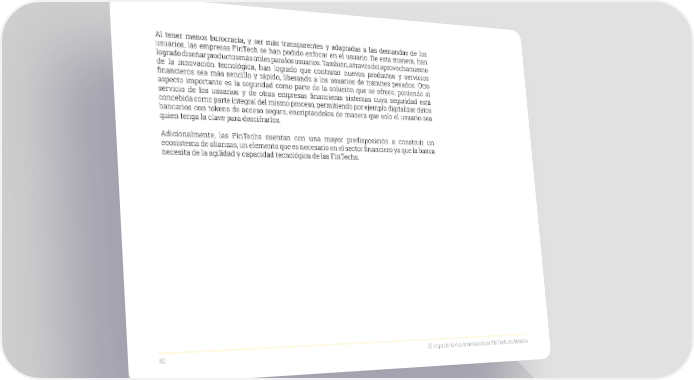 Al tener menos burocracia, y ser más transparentes y adaptadas a las demandas de los usuarios, las empresas FinTech se han podido enfocar en el usuario. De esta manera, han logrado diseñar productos más útiles para los usuarios. También, a través del aprovechamiento de la innovación tecnológica, han logrado que contratar nuevos productos y servicios financieros sea más sencillo y rápido, liberando a los usuarios de trámites pesados. Otro aspecto importante es la seguridad como parte de la solución que se ofrece, poniendo al servicio de los usuarios y de otras empresas financieras sistemas cuya seguridad está concebida como parte integral del mismo proceso, permitiendo por ejemplo digitalizar datos bancarios con tokens de acceso seguro, encriptándolos de manera que solo el usuario sea quien tenga la clave para descifrarlos. Adicionalmente, las FinTechs cuentan con una mayor predisposición a construir un ecosistema de alianzas, un elemento que es necesario en el sector financiero ya que la banca necesita de la agilidad y capacidad tecnológica de las FinTechs. 32 El impacto de las innovaciones FinTech en México