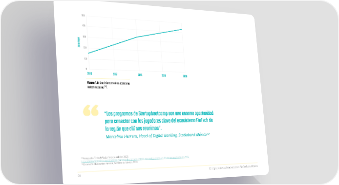 500 400 300 #startups200 100 0 2016 2017 2018 2019 2020 Figura 1.6: Crecimiento anual del ecosistema [15] FinTech mexicano. . “Los programas de Startupbootcamp son una enorme oportunidad para conectar con los jugadores clave del ecosistema FinTech de la región que allí nos reunimos”. [16] Marcelino Herrera, Head of Digital Banking, Scotiabank México [15]Finnovista Fintech Radar México edición 2020. https://www.finnovista.com/radar/el-numero-de-startups-fintech-en-mexico-crecio-un-14-en-un-ano-hasta-las-441/ [16]Entrevista aMarcelino Herrera, Scotiabank México, 2020. 20 El impacto de las innovaciones FinTech en México