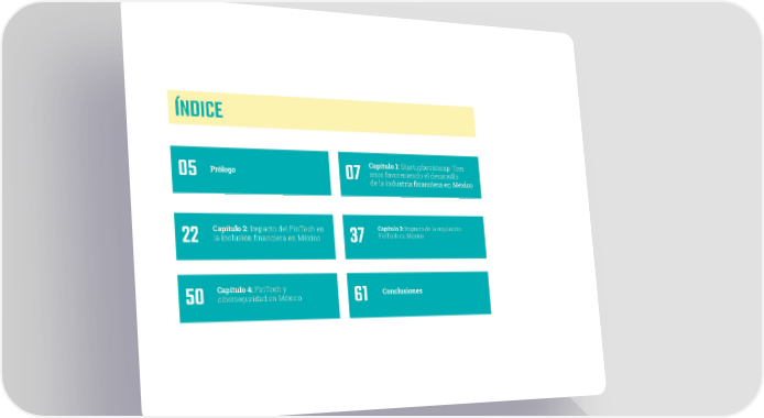 ÍNDICE Capítulo 1: Startupbootcamp: Tres 05 Prólogo 07 años favoreciendo el desarrollo de la industria financiera en México Capítulo 2: Impacto del FinTech en Capítulo 3: Impacto de la regulación 22 la inclusión financiera en México 37 FinTech en México Capítulo 4: FinTech y Conclusiones 50 ciberseguridad en México 61