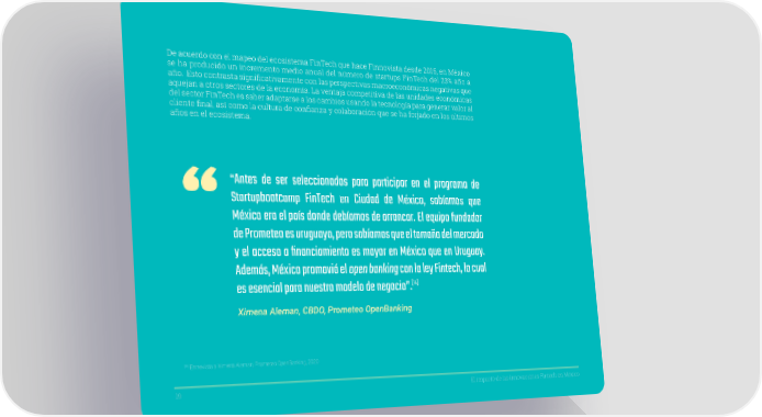 De acuerdo con el mapeo del ecosistema FinTech que hace Finnovista desde 2016, en México se ha producido un incremento medio anual del número de startups FinTech del 23% año a año. Esto contrasta significativamente con las perspectivas macroeconómicas negativas que aquejan a otros sectores de la economía. La ventaja competitiva de las unidades económicas del sector FinTech es saber adaptarse a los cambios usando la tecnología para generar valor al cliente final, así como la cultura de confianza y colaboración que se ha forjado en los últimos años en el ecosistema. “Antes de ser seleccionados para participar en el programa de Startupbootcamp FinTech en Ciudad de México, sabíamos que México era el país donde debíamos de arrancar. El equipo fundador de Prometeo es uruguayo, pero sabíamos que el tamaño del mercado y el acceso a financiamiento es mayor en México que en Uruguay. Además, México promovió el open banking con la ley Fintech, lo cual [14] es esencial para nuestro modelo de negocio”. Ximena Aleman, CBDO, Prometeo OpenBanking [14] Entrevista a Ximena Aleman, Prometeo OpenBanking, 2020. 19 El impacto de las innovaciones Fintech en México