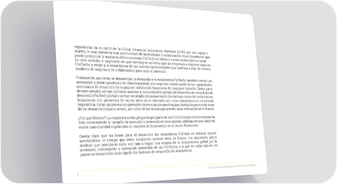regulatoria, ya es parte de la Global Financial Innovation Network (GFIN, por sus siglas en inglés), lo cual presenta una oportunidad de aprendizaje y colaboración muy importante, que puede potenciar la madurez del ecosistema FinTech en México a una escala internacional. En este sentido, el segmento de open banking es un tema que ya empiezan a explorar algunas FinTechs y están a la expectativa de las nuevas oportunidades que podrían surgir de nuevos modelos de negocio y de colaboración para salir al mercado. Finalmente, así como se desarrollan la demanda y el ecosistema FinTech, también crecen las amenazas y preocupaciones de ciberseguridad, que seguirán siendo parte de las capacidades esenciales de desarrollo de cualquier institución financiera de cualquier tamaño. Como parte de este estudio, se han utilizado análisis y conocimiento global del desarrollo de otros hubs de desarrollo FinTech global y se han recabado opiniones tanto de startups como de instituciones financieras con presencia de varios años en el mercado así como consultas con la entidad regulatoria. Estas opiniones nos permiten tener una perspectiva que ilustra los puntos de vista de los temas de impacto actual, así como de los temas que prevén sean relevantes en el futuro. ¿Por qué México? La respuesta a esta pregunta por parte de las FinTechs que entrevistamos ha sido contundente: el tamaño de mercado y potencial es muy grande, además de que cada vez existe más claridad regulatoria en materia de innovación en el sector financiero. Queda claro que las bases para el desarrollo del ecosistema FinTech en México siguen asentándose, al tiempo que están surgiendo nuevos retos de futuro. Los siguientes pasos tendrán que orientarse cada vez más a lograr una mejora de la competencia global por la inversión, crecimiento y operación sostenida de las FinTechs, y a que en cada uno de los países se desarrollen más rápido los factores de desarrollo del ecosistema. 6 El impacto de las innovaciones FinTech en México
