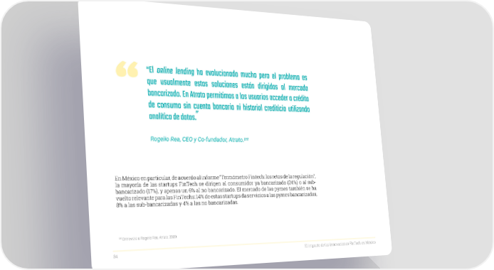 “El online lending ha evolucionado mucho pero el problema es que usualmente estas soluciones están dirigidas al mercado bancarizado. En Atrato permitimos a los usuarios acceder a crédito de consumo sin cuenta bancaria ni historial crediticio utilizando ” analítica de datos. Rogelio Rea, CEO y Co-fundador, Atrato.[25] En México en particular, de acuerdo al informe “Termómetro Fintech: los retos de la regulación”, la mayoría de las startups FinTech se dirigen al consumidor ya bancarizado (24%) o al sub- bancarizado (17%), y apenas un 6% al no bancarizado. El mercado de las pymes también se ha vuelto relevante para las FinTechs: 14% de estas startups da servicios a las pymes bancarizadas, 8% a las sub-bancarizadas y 4% a las no bancarizadas. [25] Entrevista a Rogelio Rea, Atrato, 2020. 34 El impacto de las innovaciones FinTech en México