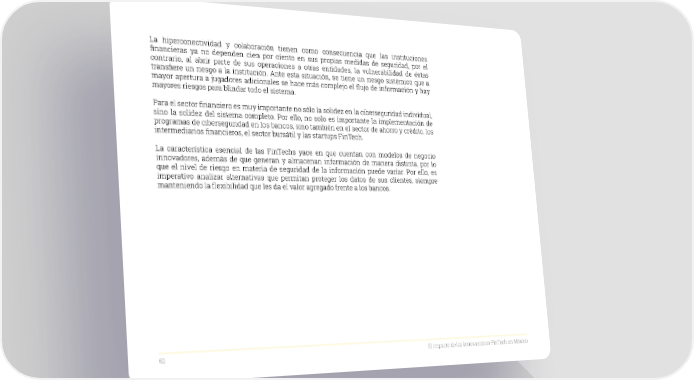 La hiperconectividad y colaboración tienen como consecuencia que las instituciones financieras ya no dependen cien por ciento en sus propias medidas de seguridad, por el contrario, al abrir parte de sus operaciones a otras entidades, la vulnerabilidad de éstas transfiere un riesgo a la institución. Ante esta situación, se tiene un riesgo sistémico que a mayor apertura a jugadores adicionales se hace más complejo el flujo de información y hay mayores riesgos para blindar todo el sistema. Para el sector financiero es muy importante no sólo la solidez en la ciberseguridad individual, sino la solidez del sistema completo. Por ello, no solo es importante la implementación de programas de ciberseguridad en los bancos, sino también en el sector de ahorro y crédito, los intermediarios financieros, el sector bursátil y las startups FinTech. La característica esencial de las FinTechs yace en que cuentan con modelos de negocio innovadores, además de que generan y almacenan información de manera distinta, por lo que el nivel de riesgo en materia de seguridad de la información puede variar. Por ello, es imperativo analizar alternativas que permitan proteger los datos de sus clientes, siempre manteniendo la flexibilidad que les da el valor agregado frente a los bancos. 52 El impacto de las innovaciones FinTech en México