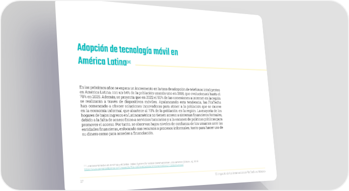 Adopción de tecnología móvil en [21] América Latina En los próximos años se espera un incremento en la tasa de adopción de teléfonos inteligentes en América Latina, con un 64% de la población usando uno en 2018, que evolucionará hasta el 78% en 2025. Además, se proyecta que en 2022 el 90% de las conexiones a internet en la región se realizarán a través de dispositivos móviles. Apalancando esta tendencia, las FinTechs han comenzado a ofrecer soluciones innovadoras para atraer a la población que se mueve en la economía informal, que abastece al 70% de la población en la región. La mayoría de los hogares de bajos ingresos en Latinoamérica no tienen acceso a sistemas financieros formales, debido a la falta de acceso físico a servicios bancarios y a la escasez de políticas públicas para promover el acceso. Por tanto, se observan bajos niveles de confianza de los usuarios ante las entidades financieras, enfocando sus recursos a procesos informales, tanto para hacer uso de su dinero como para acceder a financiación. [21] La Economía Móvil en América y el Caribe. Global System for Mobile Communication Latin America (GSMA LA), 2018 https://www.gsmaintelligence.com/research/?file=6823ce60a8b9e547cb4ed1d85c6215d8&download 27 El impacto de las innovaciones FinTech en México