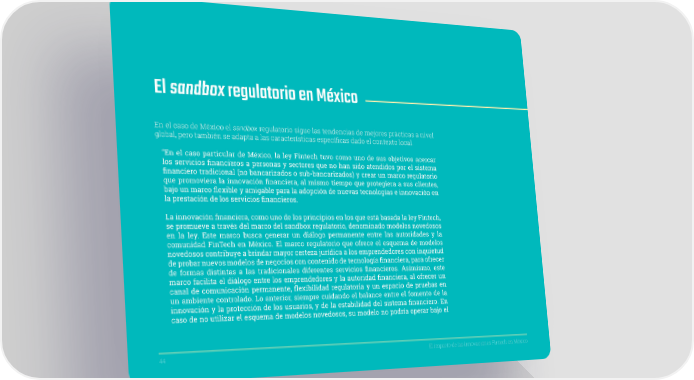 El sandbox regulatorio en México En el caso de México el sandbox regulatorio sigue las tendencias de mejores prácticas a nivel global, pero también se adapta a las características específicas dado el contexto local. “En el caso particular de México, la ley Fintech tuvo como uno de sus objetivos acercar los servicios financieros a personas y sectores que no han sido atendidos por el sistema financiero tradicional (no bancarizados o sub-bancarizados) y crear un marco regulatorio que promoviera la innovación financiera, al mismo tiempo que protegiera a sus clientes, bajo un marco flexible y amigable para la adopción de nuevas tecnologías e innovación en la prestación de los servicios financieros. La innovación financiera, como uno de los principios en los que está basada la ley Fintech, se promueve a través del marco del sandbox regulatorio, denominado modelos novedosos en la ley. Este marco busca generar un diálogo permanente entre las autoridades y la comunidad FinTech en México. El marco regulatorio que ofrece el esquema de modelos novedosos contribuye a brindar mayor certeza jurídica a los emprendedores con inquietud de probar nuevos modelos de negocios con contenido de tecnología financiera, para ofrecer de formas distintas a las tradicionales diferentes servicios financieros. Asimismo, este marco facilita el diálogo entre los emprendedores y la autoridad financiera, al ofrecer un canal de comunicación permanente, flexibilidad regulatoria y un espacio de pruebas en un ambiente controlado. Lo anterior, siempre cuidando el balance entre el fomento de la innovación y la protección de los usuarios, y de la estabilidad del sistema financiero. En caso de no utilizar el esquema de modelos novedosos, su modelo no podría operar bajo el 44 El impacto de las innovaciones Fintech en México