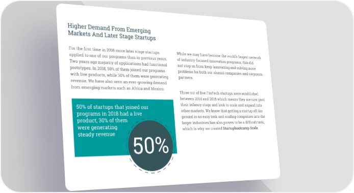 Higher Demand From Emerging Markets And Later Stage Startups For the first time in 2016 more later stage startups While we may have become the world’s largest network applied to one of our programs than in previous years. of industry-focused innovation programs, this did Two years ago majority of applications had functional not stop us from keep innovating and solving more prototypes. In 2018, 50% of them joined our programs problems for both our alumni companies and corporate with live products, while 30% of them were generating partners. revenue. We have also seen an ever-growing demand from emerging markets such as Africa and Mexico. Three out of five FinTech startups were established between 2014 and 2016 which means they are now past 50% of startups that joined our their infancy stage and look to scale and expand into programs in 2018 had a live other markets. We know that getting a startup off the product, 30% of them ground is no easy task and scaling companies into the were generating larger industries has also proven to be a difficult task, steady revenue 50% which is why we created Startupbootcamp Scale.