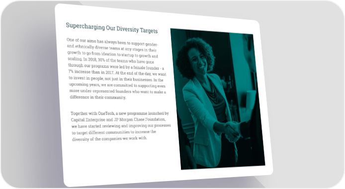 Supercharging Our Diversity Targets One of our aims has always been to support gender- and ethnically diverse teams at any stages in their growth to go from ideation to startup to growth and scaling. In 2018, 30% of the teams who have gone through our programs were led by a female founder - a 7% increase than in 2017. At the end of the day, we want to invest in people, not just in their businesses. In the upcoming years, we are committed to supporting even more under-represented founders who want to make a difference in their community. Together with OneTech, a new programme launched by Capital Enterprise and JP Morgan Chase Foundation, we have started reviewing and improving our processes to target different communities to increase the diversity of the companies we work with.