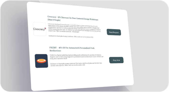Civocracy - 10% Discount On User-Centered Design Workshops (Max 8 People) Civocracy developed several praxis oriented 0.5 day to 2 days workshops based on its experiences with clients of public, private and semi-public sector on how to engage your stakeholders and how to lead purposeful change management in your company, as well as GDPR training for start-ups. To redeem the deal please email [email protected] and use Send Request subject line “SBC Christmas Discount - Workshops”. Exclusive to Startupbootcamp members. Offers ends on 31st December 2018. FRIZBIT - 40% Off For Automated & Personalized Push Notifications Frizbit is a digital marketing SaaS providing push notifications for any kind of websites. Register now to start using triggered & personalised push notifications on your website and bring your customers back! Shop Now Exclusive to Startupbootcamp members! The deal is valid for all plans and the first-time annual subscriptions. Offers ends on 21st December 2018.
