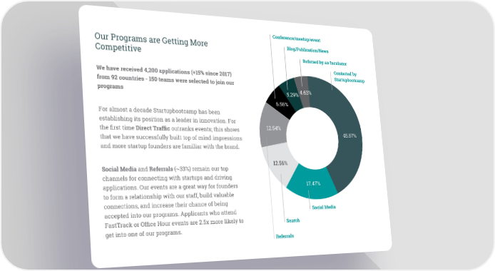 Conference/meetup/event Our Programs are Getting More Blog/Publication/News Competitive Referred by an Incubator Contacted by We have received 4,200 applications (+15% since 2017) Startupbootcamp from 92 countries - 150 teams were selected to join our programs 5.29% 4.63% 6.56% For almost a decade Startupbootcamp has been establishing its position as a leader in innovation. For the first time Direct Traffic outranks events; this shows 12.54% that we have successfully built top of mind impressions 45.57% and more startup founders are familiar with the brand. Social Media and Referrals (~33%) remain our top 12.56% channels for connecting with startups and driving applications. Our events are a great way for founders 17.47% to form a relationship with our staff, build valuable connections, and increase their chance of being accepted into our programs. Applicants who attend Social Media FastTrack or Office Hour events are 2.5x more likely to Search get into one of our programs. Referrals
