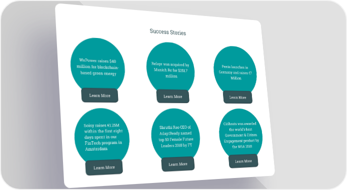 Success Stories WePower raises $40 Relayr was acquired by Penta launches in million for blockchain- Munich Re for $251.7 Germany and raises €7 based green energy million Million Learn More Learn More Learn More Soisy raises €1.25M Shruthi Rao CEO of Citibeats was awarded within the first eight AdaptReady named the world’s best days spent in our top 50 Female Future Government & Citizen FinTech program in Engagement product by Amsterdam Leaders 2018 by FT the WSA 2018 Learn More Learn More Learn More