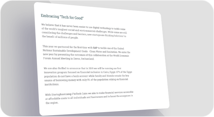 Embracing “Tech for Good” We believe that it has never been easier to use digital technology to tackle some of the world’s toughest social and environmental challenges. While some are still considering the challenges and barriers, new startups are thinking ‘solutions’ to the benefit of millions of people. This year we partnered for the first time with SAP to tackle one of the United Nations Sustainable Development Goals - Clean Water and Sanitation. We enter the new year by presenting the outcomes of this collaboration at the World Economic Forum Annual Meeting in Davos, Switzerland. We are also thrilled to announce that in 2019 we will be running our first innovation program focused on financial inclusion in Cairo, Egypt. 67% of the Egypt population do not have a bank account while family and friends remain the key source of borrowing money with only 9% of the population relying on financial institutions. With Startupbootcamp FinTech Cairo we aim to make financial services accessible at affordable costs to all individuals and businesses and to boost the ecosystem in the region.
