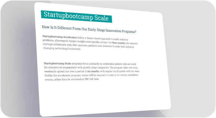 Startupbootcamp Scale How Is It Different From Our Early-Stage Innovation Programs? Startupbootcamp Accelerators follow a theme-based approach to tackle industry problems, allowing for deeper insights into specific sectors. For three months, the selected startups collaborate with 400+ mentors, partners, and investors to scale their industry- changing technology businesses. Startupbootcamp Scale programs focus primarily on established players who are ready for commercial engagement with growth stage companies. The program takes over long weekends spread out over a period of six months, with regular touch points with our team. Unlike the accelerator program, teams will be required to come in for certain mandatory events, rather than be stationed at SBC full time.