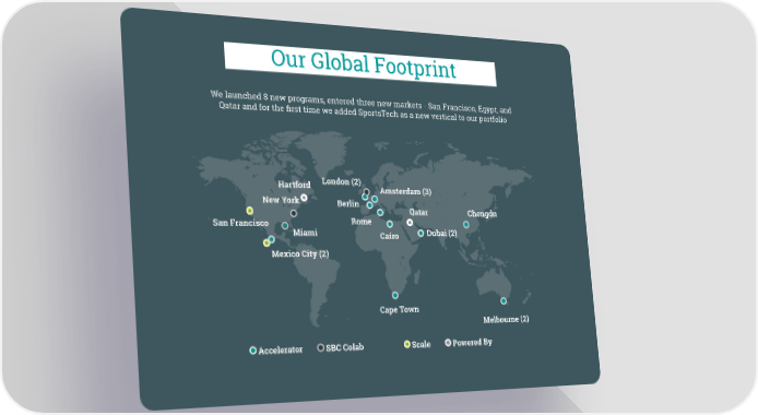 Our Global Footprint We launched 8 new programs, entered three new markets - San Francisco, Egypt, and Qatar and for the first time we added SportsTech as a new vertical to our portfolio Hartford London (2) Amsterdam (3) New York Berlin Qatar Chengdu San Francisco Rome Miami Cairo Dubai (2) Mexico City (2) Cape Town Melbourne (2) Accelerator SBC Colab Scale Powered By