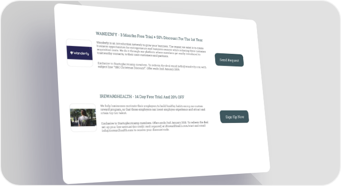 WANDERFY - 3 Months Free Trial + 50% Discount For The 1st Year Wanderfy is an introduction network to grow your business. The reason we exist is to create business opportunities for entrepreneurs and business owners while reducing their customer acquisition costs. We do it through our platform where members get easily introduced to trustworthy contacts, to their next customers and partners. Send Request Exclusive to Startupbootcamp members. To redeem the deal email [email protected] with subject line: ”SBC Christmas Discount”. Offer ends 2nd January 2019. IREWARDHEALTH - 14 Day Free Trial And 20% OFF We help businesses motivate their employees to build healthy habits using our custom reward program, so that those employers can boost employee experience and attract and retain top tier talent. Sign Up Now Exclusive to Startupbootcamp members. Offers ends 2nd January 2018. To redeem the deal set up your free account (no credit card required) at iRewardHealth.com/start and email [email protected] to receive your discount code.