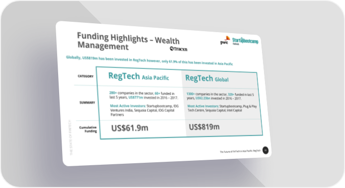Funding Highlights – Wealth Management Globally, US$819mhasbeeninvestedinRegTechhowever,only61.9%ofthishasbeeninvestedinAsiaPacific CATEGORY RegTechAsia Pacific RegTech Global 280+companies in the sector, 60+ funded in 1300+ companies in the sector, 320+ funded in last 5 last 5 years, US$771m invested in 2016 – 2017. years, US$2.23bn invested in 2016 – 2017. SUMMARY Most Active Investors: Startupbootcamp, IDG Most Active Investors: Startupbootcamp, Plug & Play Ventures India, Sequoia Capital, IDG Capital Tech Centre, Sequoia Capital, Intel Capital Partners CH TE Cumulative N I Funding US$61.9m US$819m F F O TE TA S E TH The Future of FinTech in Asia Pacific: RegTech 68