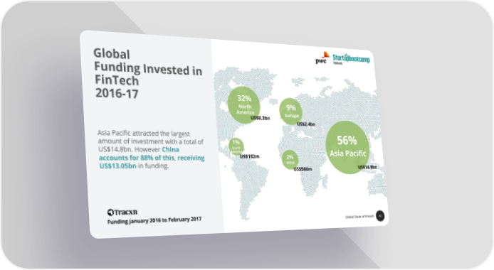 Global Funding Invested in FinTech 2016-17 32% North 9% America Europe US$8.3bn US$2.4bn Asia Pacific attracted the largest 56% amount of investment with a total of 1% US$14.8bn. However China South America Asia Pacific accounts for 88% of this, receiving US$182m 2% US$13.05bnin funding. MENA US$560m US$14.8bn CH TE N I F F O TE TA S E THFundingJanuary2016toFebruary2017 Global State of Fintech 46